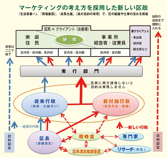| 新しい行政 従来行政+新付加行政 (実現手法・戦略) 従来の“制度・仕組み作り”の行政に加えて、本来の目的を達成・実現するための手法や戦略を区側が準備して、両方セットにして実行することで、その施策の成果をあげ、本来の目的を達成するものです。それが税金の有効活用にもつながるのです。 区長はテーマ(課題)を選定してプロジェクト化。直属機関の『戦略室』と「区民満足度調査室」でリサーチ(民意の調査)と専門家からのヒアリングをおこない、基本構想(戦略・方策)を作り上げます。それを受けて、“制度・仕組み作り”の部署と“実現手法・戦略を具体化する部署”とが連携して、最終的な施策にまとめた上で、実行部門にバトンタッチします。その後は戦略室が、これもマーケティングの手法である PDCA(計画~実行~検証~対策)の流れで、その施策の目的実現(成果)を確実なものにしてゆきます。 |